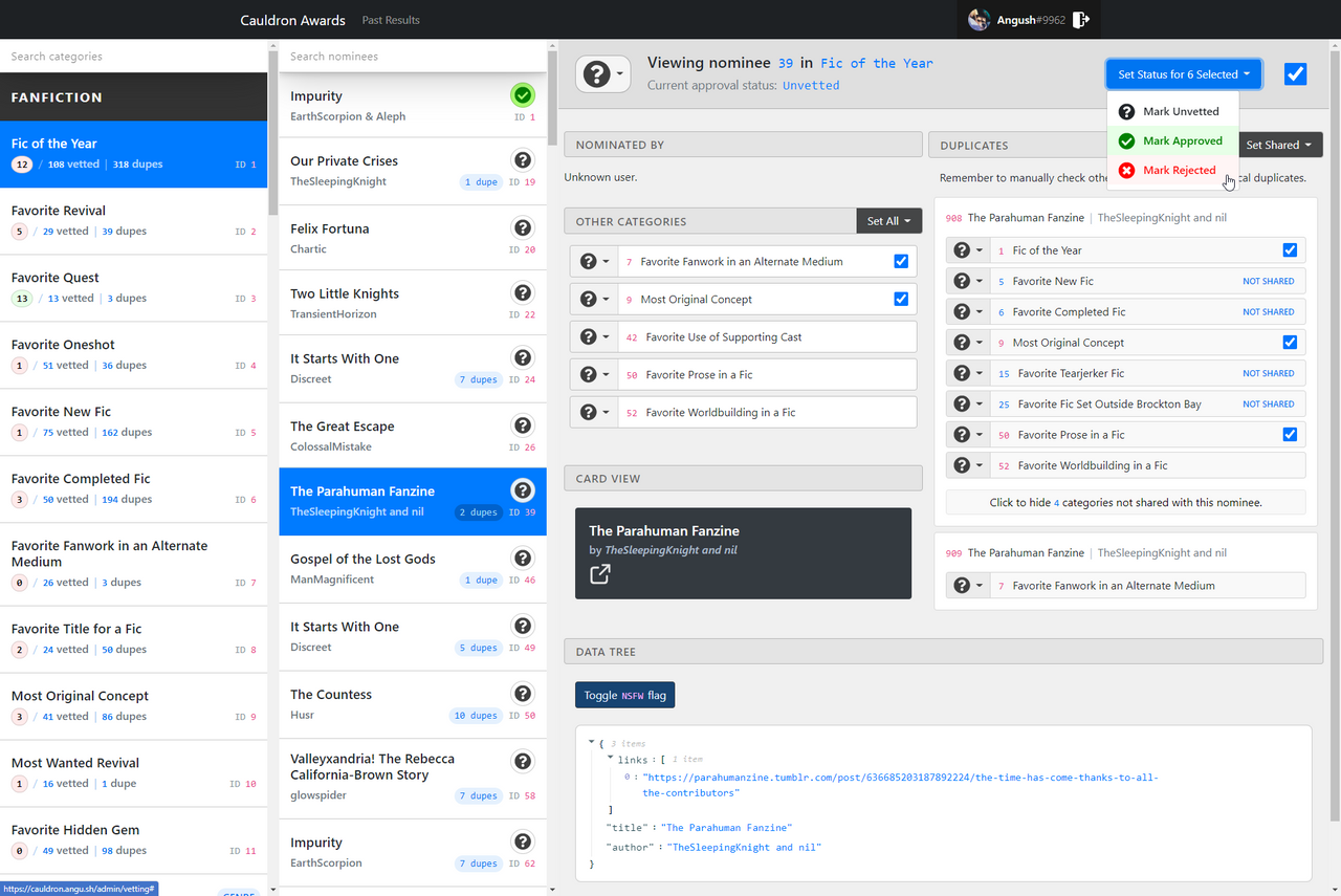 Utilizing Discord OAuth2 for login, this web app facilitates the nomination and voting processes, allows whitelisted moderators to sanitise user input and vet and reject entrants, and provides a beautiful and shareable record of past results.