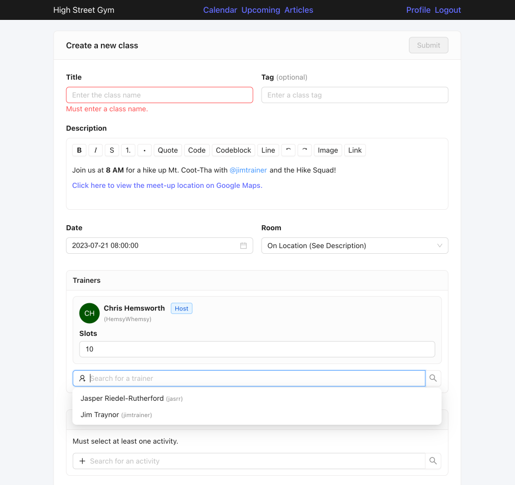 A full-stack TypeScript application built using React and Node.js, the High Street Gym website enables users to register accounts and sign up to attend gym classes created by designated trainers (using role-based access control).