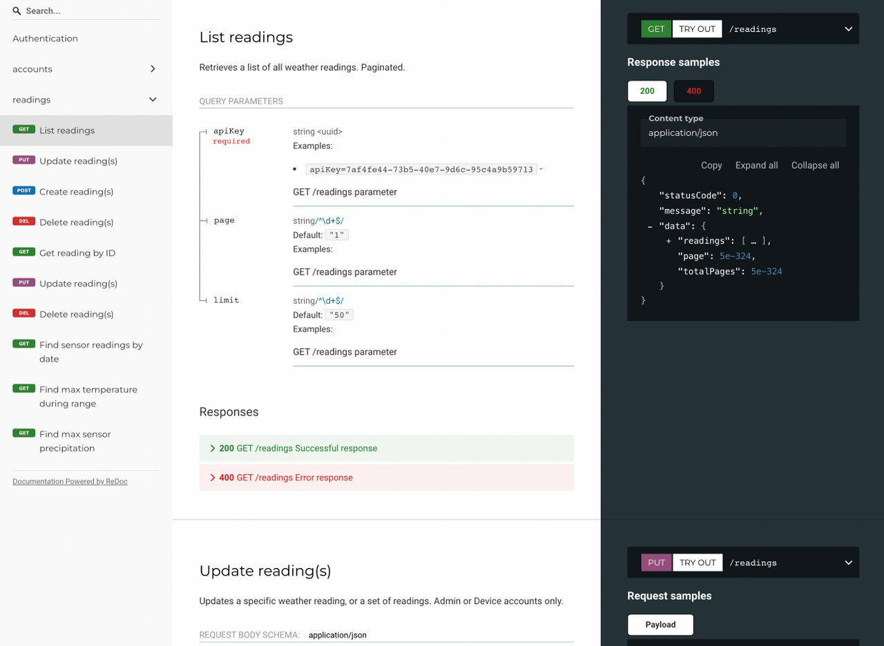 Additionally, all API endpoints include inline documentation which is used at buildtime to generate an OpenAPI specification, presented via Redoc.